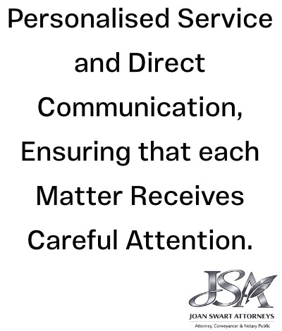 Joan Swart Attorneys is a client-focused legal practice dedicated to providing efficient, practical, and results-driven legal solutions. As a sole practitioner, Joan-Louise Swart offers personalised service and direct communication, ensuring that each matter receives careful attention and is handled with professionalism and integrity.